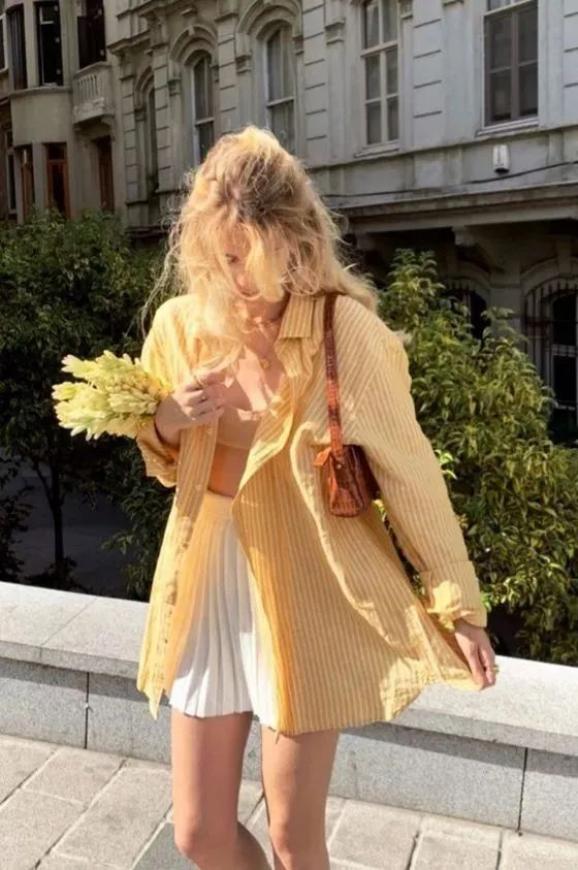 还有“上长下短”的穿法,用一件长衬衫当外套,搭配T恤和短裤,显高又显腿长。