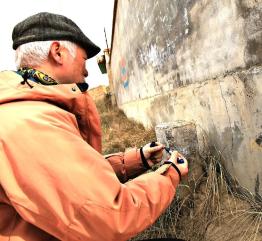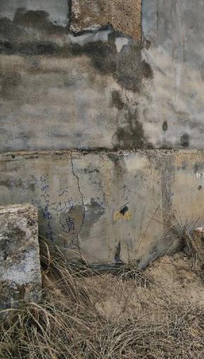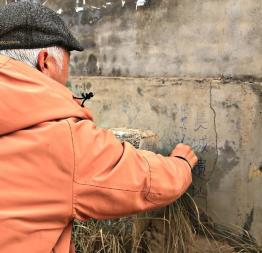 走在土垅上(原边墙位置 )的张泽华大叔(77岁)大爷说这里有长城的界桩,带我们去的路上遇到了一位正去买肉的张泽华大叔。在两位老先生的共同确认下,找到了字迹已模糊的界桩,老师用手边仅有的一支硬水笔,在界桩旁边的水泥墙上做了标记,以方便后来人。