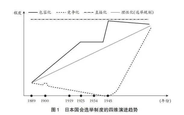 通过梳理日本国会选举制度在包容化、竞争化、直接化和理性化四个维度的演进情况,本文发现:包容化水平从1889年首开国会选举以来不断提高,1925年实现男子普选,1945年实现全民普选,不过,候选人保证金制和选区定额不均衡问题的存在使第二次世界大战后日本国会选举制度的包容性还有所欠缺;竞争化水平总体上以1945年为界呈现先减后增的趋势,虽然早在1900年就开启了秘密投票制度,但大日本帝国时期的政党选举竞争被日益严苛的行政规制破坏,直到第二次世界大战后建立较为公正的选举管理机构,才将政党竞选置于一个公平的规制环境中,但候选准入具有明显的大党偏向,这是目前日本国会选举制度在竞争性方面存在的问题;直接化在1889年首开国会选举时就已经实现,不过在最初制度设计时并非毫无争议,制度设计者们曾就采用有限制的直选制还是间选制进行了多次交锋,后来为割断中央政局与地方政局的关联才舍弃最初属意的间选制;理性化水平在制度演进过程中自然是不断提高的,不过日本国会选举制度的理性化主要体现在选举规制上,唯一有区别的地方在于选举管理主体不同,战前帝国时期的选举规制具有行政规制理性化特点,战后在将选举管理机构改为选举管理委员会后,则变成了一种公正规制理性化,这中间暗含了选举管理公正性的转向。日本国会选举制度的四维演进趋势见图1。