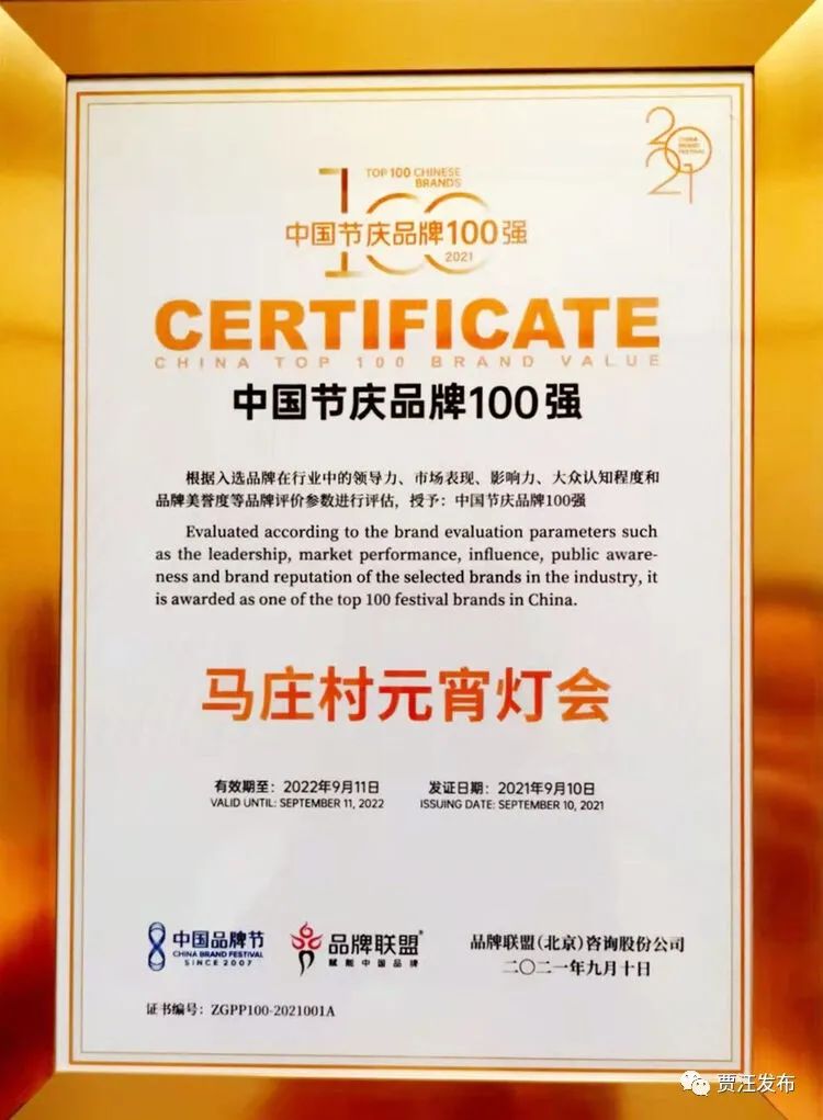 据介绍,每届品牌节评选出一批代表中国品牌形象的获奖企业或品牌,为行业树立品牌典范,助力中国品牌做大做强。本届品牌节揭晓了“2021中国品牌500强”“中国十大节庆品牌”“中国节庆品牌100强”等众多奖项,“马庄村元宵灯会”喜获“中国节庆品牌100强”称号,节庆指数为103.73,排名第55名。