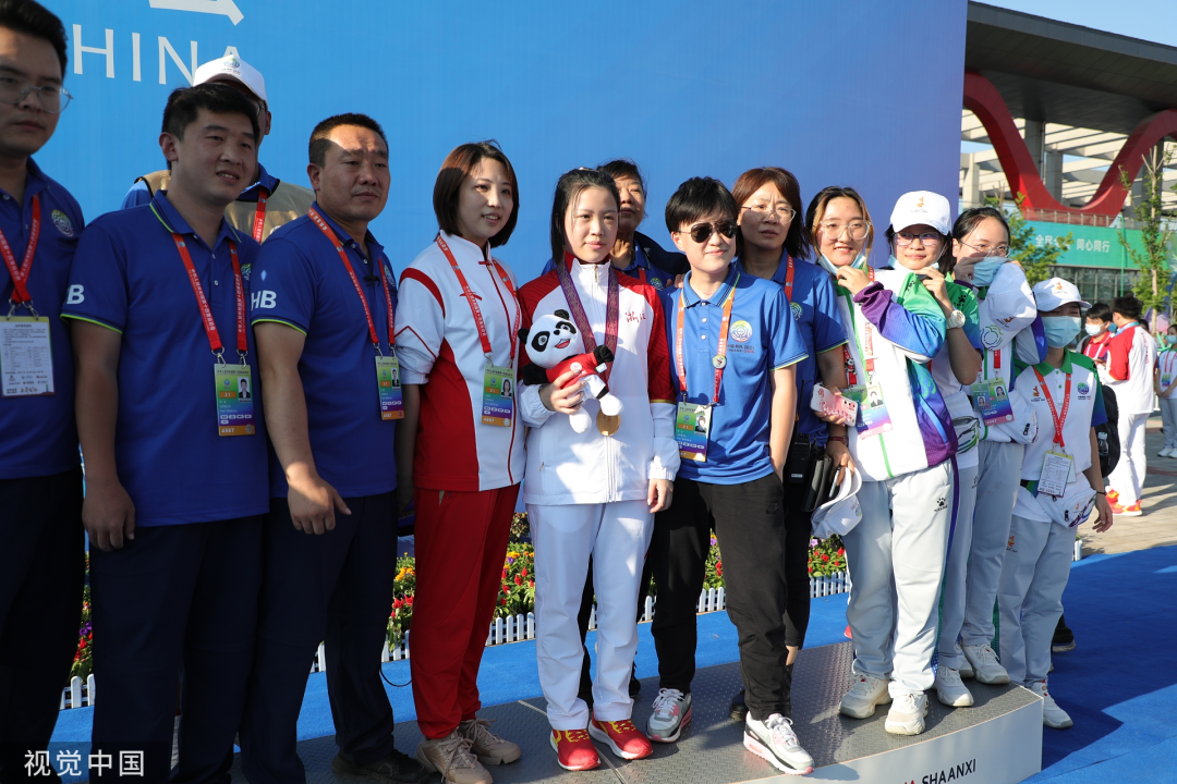 9月13日,在10米气步枪混合团体比赛中,由杨倩和杨皓然组成的超级CP射落金牌,杨倩在颁奖仪式前与现场工作人员合影,俨然成为追星现场,杨皓然也打趣:“你是明星,我得离你远点,跟我少说话吧!”虽然比赛完显得疲劳,杨倩还是尽可能配合。
