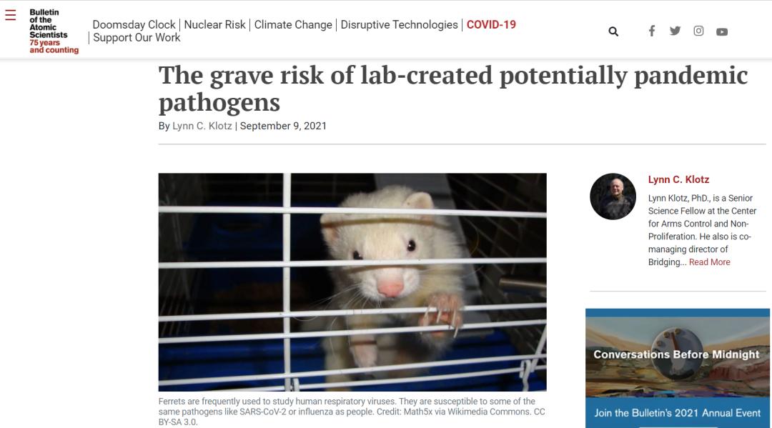 9月9日,美国军备控制与不扩散中心高级研究员林恩·克洛茨在《the Bulletin》杂志上发表了一篇题为《实验室制造的潜在流行病病原体的严重风险》的文章,披露了美国研究人员在复活病毒实验,导致病毒从实验室泄漏的种种细节。