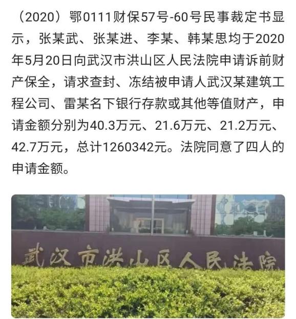 2020年5月20日,张某武、张某进、李某、韩某思等四人,分别向洪山区人民法院申请诉前财产保全,请求查封、冻结雷某公司和个人名下的财产,分别是40.3万元、21.6万元、21.2万元和42.7万元,共计126万余元。
