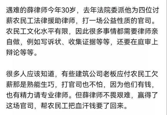 第三,薛律师只是按照法律程序,帮委托人打官司,讨要血汗钱。