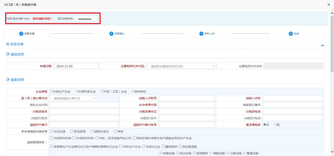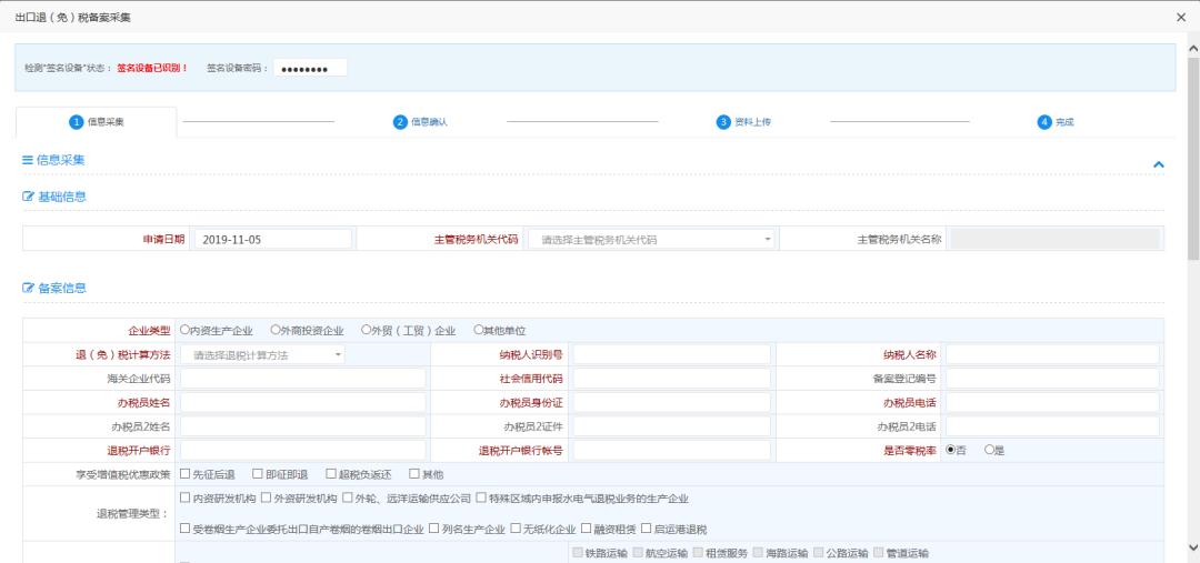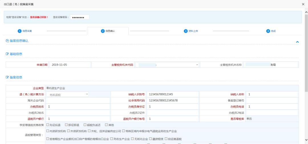 第二步:数据生成在信息采集页面采集数据,其中退税开户银行及退税开户银行账号系统会自动带出,若带出内容为空,企业需手动采集,当数据采集完成后,点击【下一步】按钮,进入信息确认页面,信息确认页面显示采集后的数据,数据只可查看不可修改。