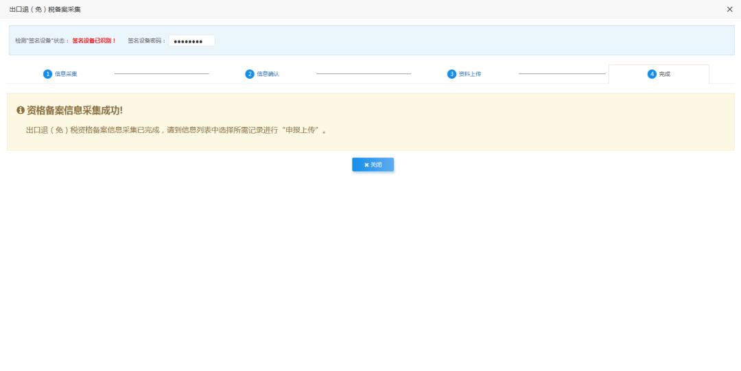 第四步:远程申报资料上传完成后,点击【下一步】按钮,进入完成页面。系统自动生成一条出口退(免)税备案申报数据,并且在办理页面显示该条申报数据。