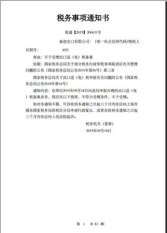 若备案结果为不予受理的,税务事项通知书样式如下图所示: