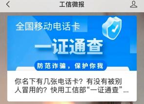 9月14日,工业和信息化部开始推出了全国移动电话卡“一证通查”便民服务,用户凭身份证就能查询个人名下登记电话卡数量,如对查询到的电话卡情况有异议,还可以进行相应处理。