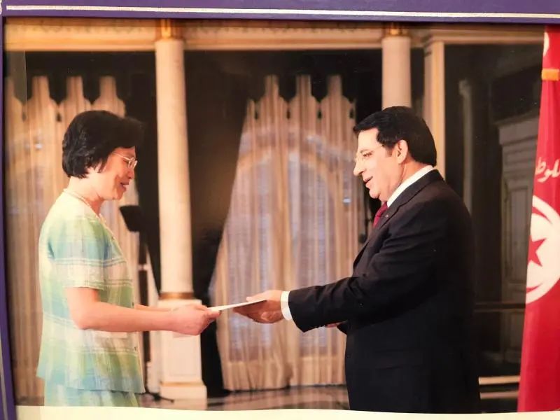 图为李蓓芬向时任突尼斯总统本·阿里递交国书。1950年的李蓓芬生在上海虹口,1964年初中毕业后考入上海外国语学院附属学校学习法语。这所学校日后成为中国外交官的摇篮,杨洁篪、王光亚、崔天凯,以及现任副外长谢锋,都在此学习。