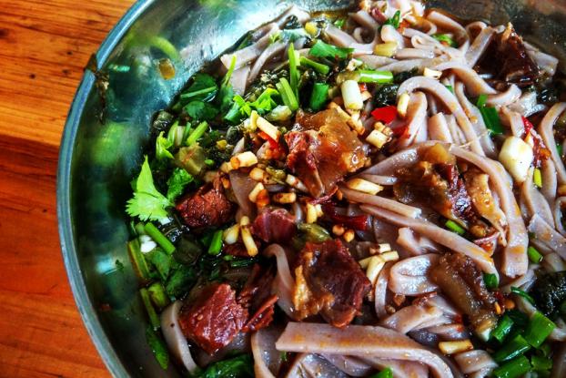 红米粉深受当地人的喜爱,它不仅拥有着独特的外观,口感也非常软糯。红米经过采收、剥壳,晾晒,研磨成浆,再由制粉师傅将米浆均匀覆盖在蒸盘上蒸制数分钟后,一张张红米皮新鲜出炉。经过晾晒、切割等工序,制好的红米粉会运往各家餐厅,煮热后撒上香菜、葱花,浇上牛肉汤汁,才能为食客们献上一份剑河特有的美味佳肴。剑河酸汤鱼