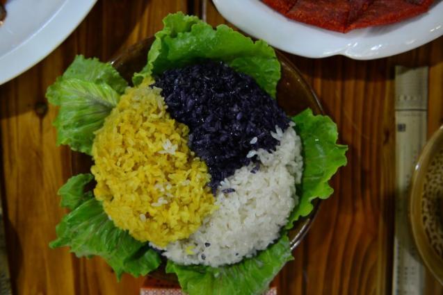 姊妹饭是用糯米做成的,使用不同植物的树叶或花朵碾压成汁液作为原色,对糯米进行浸泡,蒸熟后用手抓食。伴以腌鱼、酸汤,香甜可口,风味独特。姊妹节期间,青年男子可以向心仪的姑娘讨要“姊妹饭”,姑娘们则通过赠送藏有不同物品的“姊妹饭”传情达意。2