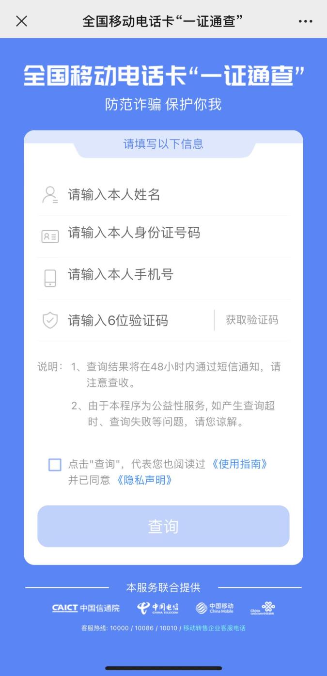 全国移动电话卡“一证通查”便民服务