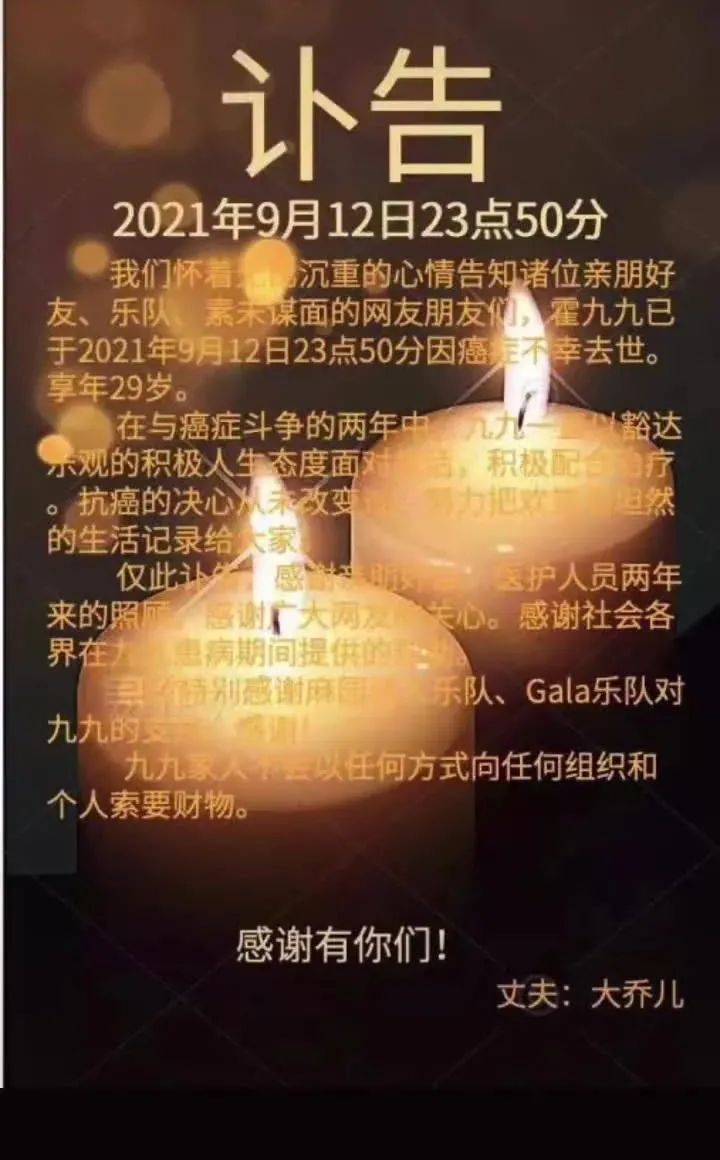 9月13日,“霍九九”的丈夫大乔儿通过妻子的账号发布讣告,称“霍九九”已于9月12日23点50分因癌症不幸去世。