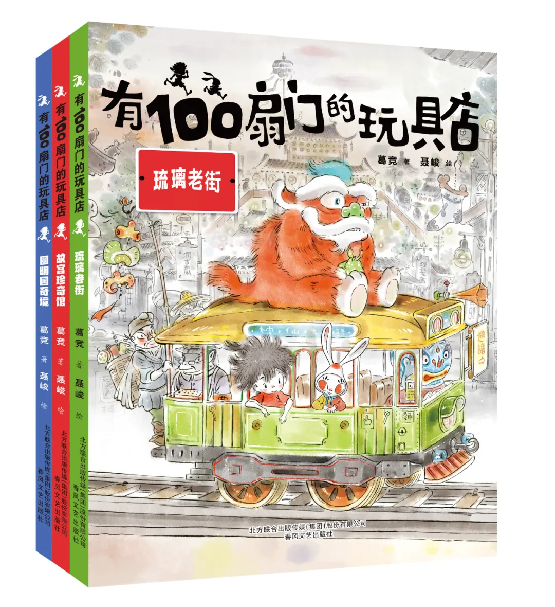 《有100扇门的玩具店》是春风文艺出版社新推出的重点原创图画书,第一辑包含《琉璃老街》《故宫珍奇馆》《圆明园奇境》三册,由2021年全国优秀儿童文学奖获奖作家葛竞创作,由著名青年漫画家聂峻绘画。故事讲述了女孩小石榴为寻找去世的爸爸留给自己的礼物,意外进入一个神奇的玩具店——有100扇门的玩具店,在玩具店里遇到了兔儿爷、布老虎、糖人等众多中国传统玩具,通过100扇各式各样、大小不一的门通向琉璃老街、故宫、圆明园等中国历史古迹,展开一段段奇幻的冒险故事。