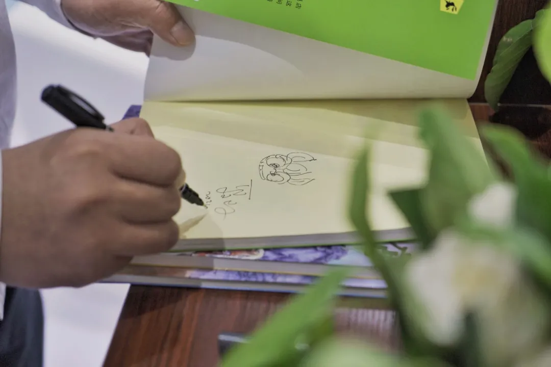 漫画家聂峻为《有100扇门的玩具店》系列创作了100多幅精美的手绘作品,聂峻的个人绘画风格突出,为这部作品创作的每张绘画都精彩绝伦。聂峻用他独特的绘画技巧,在纸上将中国玩具还原出来,呈现在小读者眼前。聂峻展示了他绘画插图的手稿到成品的全过程,还为现场的一位幸运观众绘画了一幅漫画像留念。
