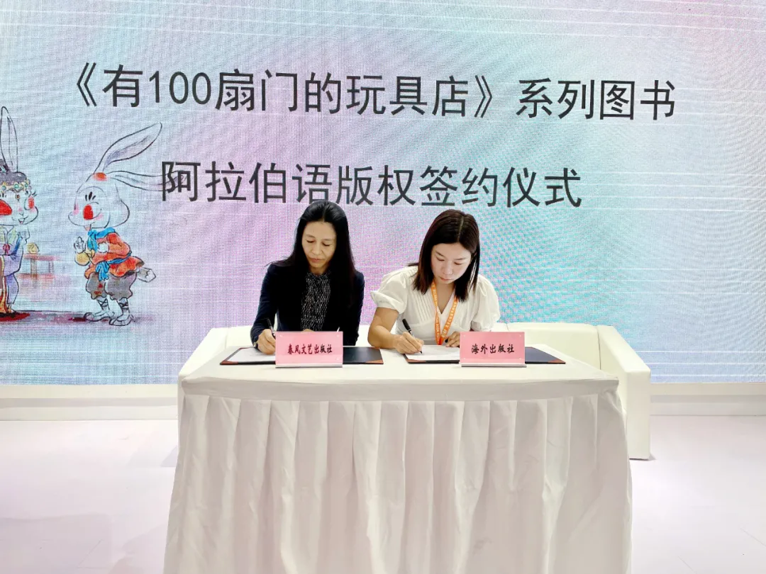 9月15日,北京国际图书博览会上,春风文艺出版社主办的“爱上了不起的中国玩具——《有100扇门的玩具店》新书发布会暨版权签约仪式”顺利举行。作品的主创团队——作家葛竞、画家聂峻等嘉宾纷纷上台,与现场的观众分享创作感悟,讲述中国玩具的全球传播意义。现场签订了阿拉伯语、印尼语、马来语三个语种的版权输出协议,《有100扇门的玩具店》的多语种图书将陆续传播到世界小读者手中。