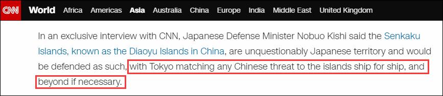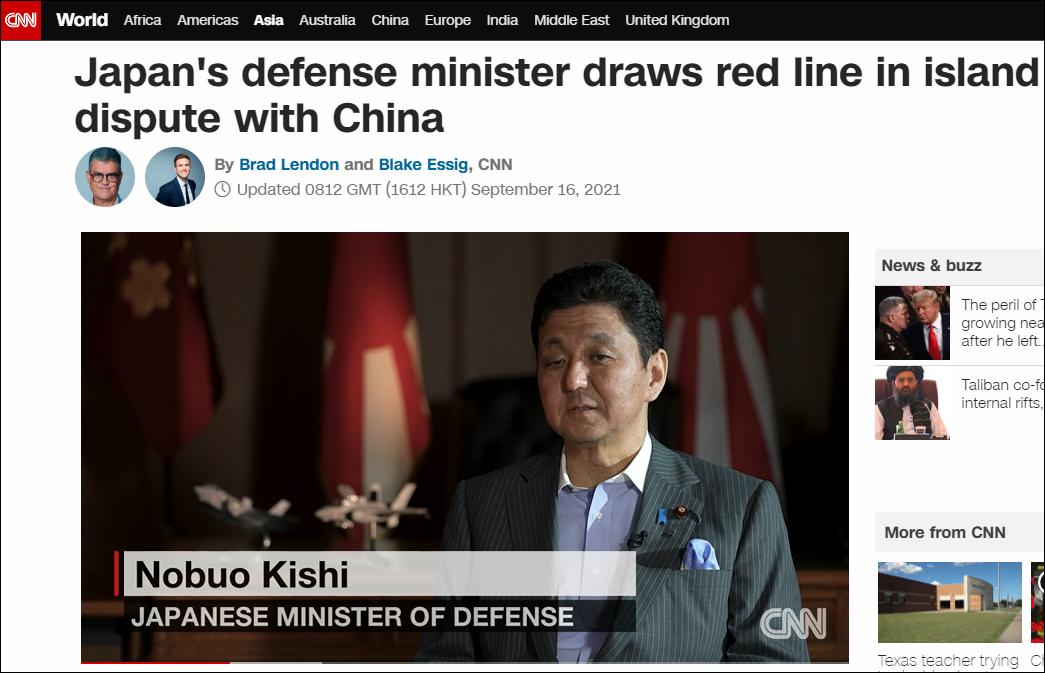 当地时间9月16日,美国有线电视新闻网(CNN)发布了一篇独家专访日本防卫大臣岸信夫的报道文章。岸信夫不仅宣称中国的钓鱼岛是日本“不可分割”的领土,强调日本将对这些岛屿进行“防卫”,同时他还扬言日本将在必要时采取行动应对中国对这些岛屿的“威胁”,甚至对中国海警船只“以舰还舰”(ship for ship)。