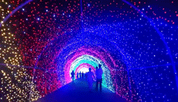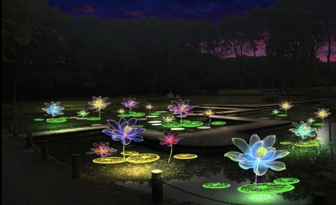 今年,植物园上新了千余套灯组,还有蝴蝶、荷花、小鹿等动植物灯组营造氛围。站在开满鲜花的植物园内,潺潺流水,轻雾缭绕,梦幻的灯下探寻花海,定别有生趣。