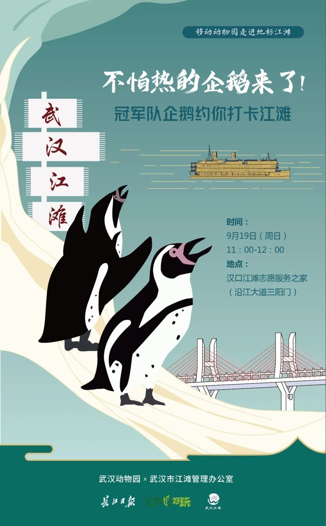 初秋的风吹到江滩带起一丝清凉,移动动物园回来了。这次武汉动物园的1支企鹅冠军队——14只洪氏环企鹅,邀请你一同打卡武汉江滩。
