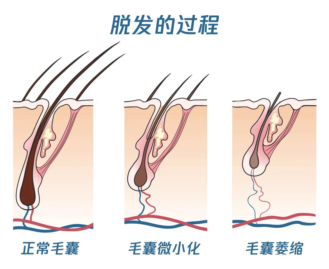 (来源:网络)雄脱者的头皮对雄激素特别敏感,受到雄激素代谢产物的刺激后,头皮毛囊就开始萎缩、退化,无法再滋养头发。