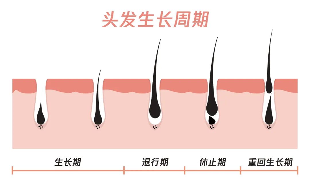 如上图所示,毛发生长周期主要由生长期(2-7年)、退行期(2-4周)、休止期(约为3个月)组成。人体近84%的头皮毛发处于生长期,约1%~2%处于退行期,还有10%~15%处于休止期。