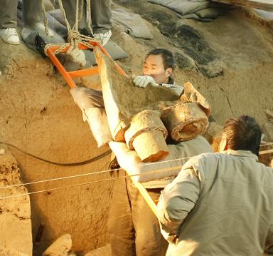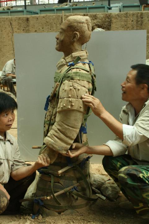 一截俑腿,一个人托举递上来,静止状态下坚持不了几分钟。“你麻利点!把人举得挣(zèng)滴!”有的陶俑躯干部分从胸到腹下浑然一体,从过洞到隔墙,再转移到修复区,全体总动员,托举哥,传接姐,依次布好阵型,扶梯上铺好软垫,缓慢地插在陶片与地面之间的空隙中,一点点移动,躺好,抬起来时形似救护队的担架。稍小的残片,双手托举,“拿好,拿好,我松手了啊”,另一人双手托接,不能用单手拎以防突然残断。整个环节中每个人都得拿出吃奶的力气,若是惜力偷奸耍滑出了纰漏将酿成大祸。