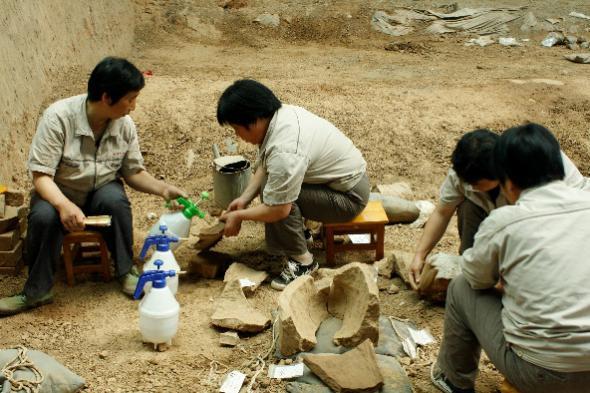 属于同一件陶俑的陶片尽量同一天提取,认陶片是首要的功夫。理想家说:“把陶俑残片一件一件取出来就行了呗。”实际上,陶俑四分五裂,残片广布,不同个体的残片互相掺杂,这个拼图的活不好干。