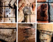 陶俑上一些隐蔽的地方刻画或戳印有文字、数字和人名,对应了秦代“物勒工名”的手工业管理制度。产品需要标明制作者,尤其是国家公器,从部长、厂长到工人,三级责任人逐层注明,如果没法刻,就蘸红漆写。袁先生说,后面的字是人名,代表了当时制作陶俑的师傅级工长,前面的字表示陶工的来源地,比如“咸阳衣”即来自咸阳地区的陶工,名字是“衣”。前面第一个字是“宫”的,来自中央官署,是主管烧造砖瓦的“宫司空”,如“宫朝”、“宫得”,“宫臧”;还有少部分出身于右司空和将作大匠。