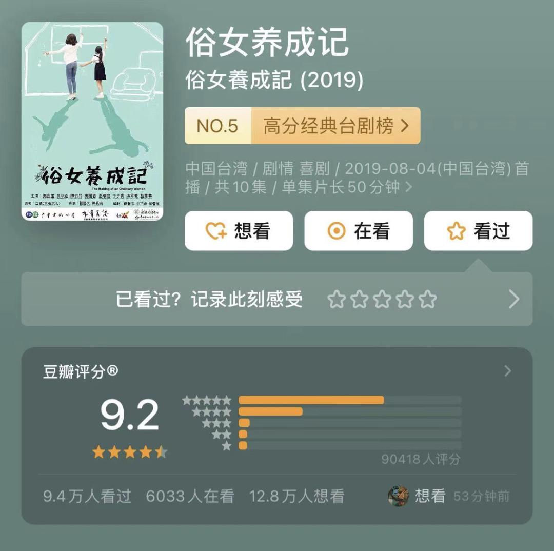 兴许是陈嘉玲的这一勇敢举动,戳中了人们内心深处,以她为主角的台剧《俗女养成记》,被近十万人打出了9.2分。