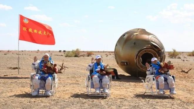 9月17日,神舟十二号载人飞船返回舱在东风着陆场成功着陆。这是航天员聂海胜(中)、刘伯明(右)、汤洪波安全顺利出舱。新华社记者琚振华摄在3个月的航天任务中