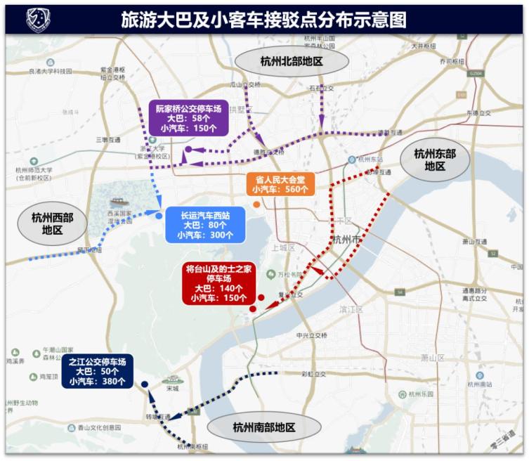3.从杭州东部地区进入景区的旅游大客车经中河路、之江路、南复路至将台山停车场和的士之家临时停放;
