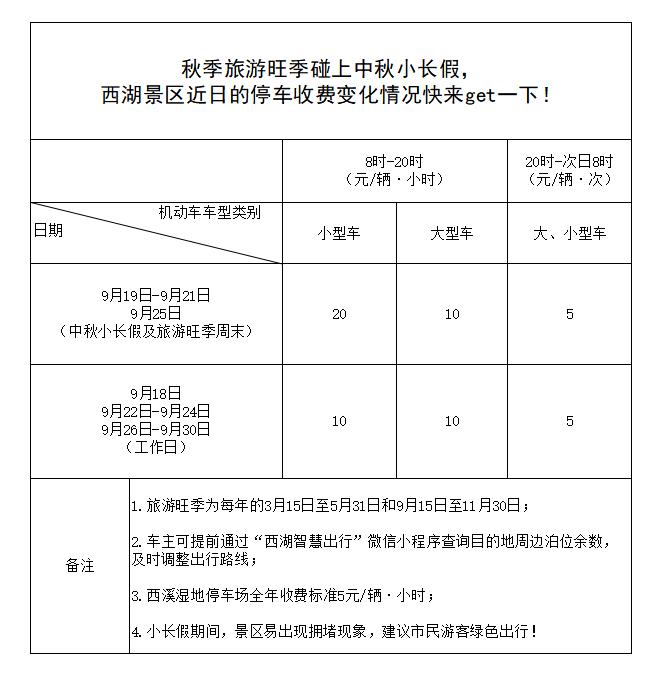 西湖景区秋季旅游旺季(9月15日至11月30日)日前已正式开启,恰逢中秋小长假来临,景区的停车收费价格有变化。