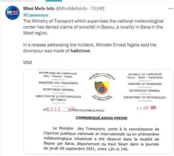 此外,推特上也出现不少“辟谣”的说法。一个简介为在线新闻报道网站的“Mimi Mefo Info”推特用户发文称,负责监督喀麦隆国家气象中心的交通运输部否认了西部地区巴纳等地降雪的说法,部长欧内斯特·恩加勒在一篇新闻稿中指出这些是冰雹。推文还配上了新闻稿声明。