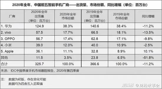 市场调研机构IDC公布的2020年中国智能手机出货量排名显示,2020年苹果位居第五,前四名一水儿的中国品牌:华为、Vivo、OPPO、小米。