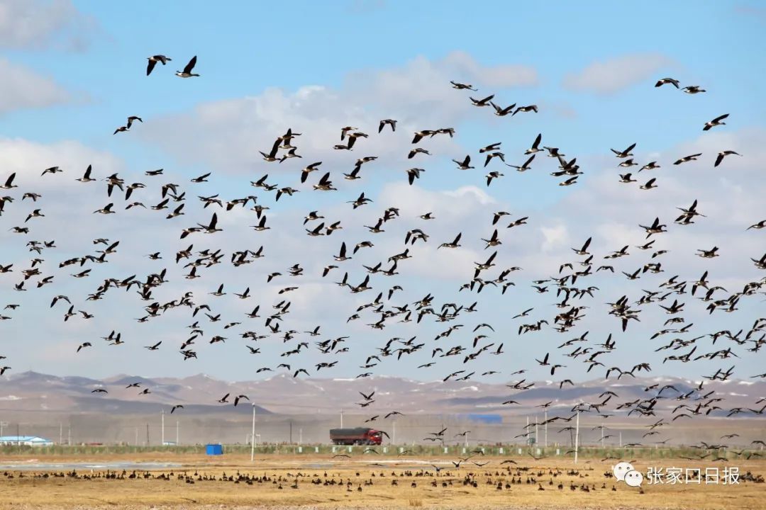 上万只迁徙候鸟大雁现身塞北管理区随着天气转暖,张家口迎来今春候鸟迁徙期。近日,上万只大雁迁徙现身塞北管理区,它们时而迎空飞舞,时而聚集觅食,场面壮观,给这片沉寂的原野增添了一道亮丽的风景线。武殿森 邢天君 摄