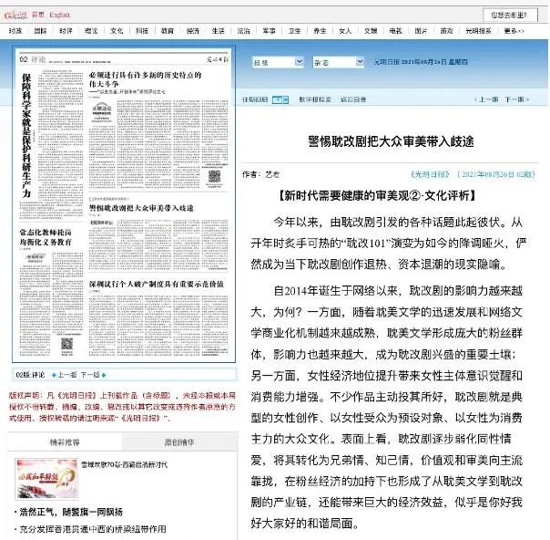 继今年4月7日《光明日报》发表《耽美作品改编盛行带偏大众审美》后,8月26日《光明日报》再次刊发评论文章《警惕耽改剧把大众审美带入歧途》,从制作、营销和观众审美三个方面对耽改作品进行了抨击,态度明确、措辞严厉。大家纷纷猜测广电总局官方何时会正式对耽改提出抵制,似乎是一只注定会落地的靴子,让人忐忑。