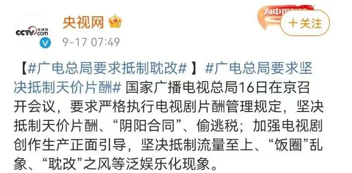 终于,9月16日,国家广播电视总局在京召开会议要求,坚决抵制流量至上、“饭圈”乱象、“耽改”之风等泛娱乐化现象。