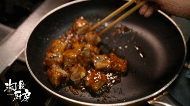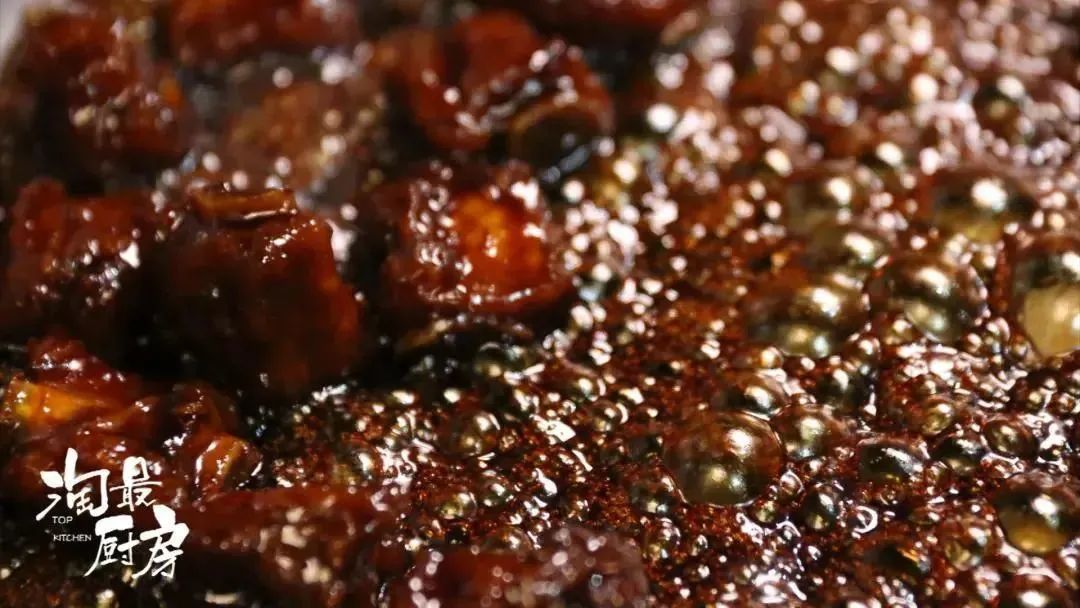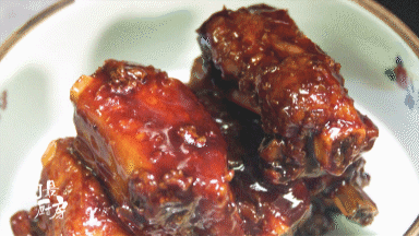 中火煎至排骨两面金黄后,均匀裹上糖色。然后开小火,同时放入话梅、黄酒、醋、生抽调味。