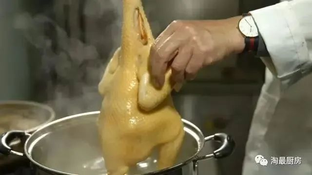 !浸冰水时将鸡拎起来,让肚子里的热水沥出。