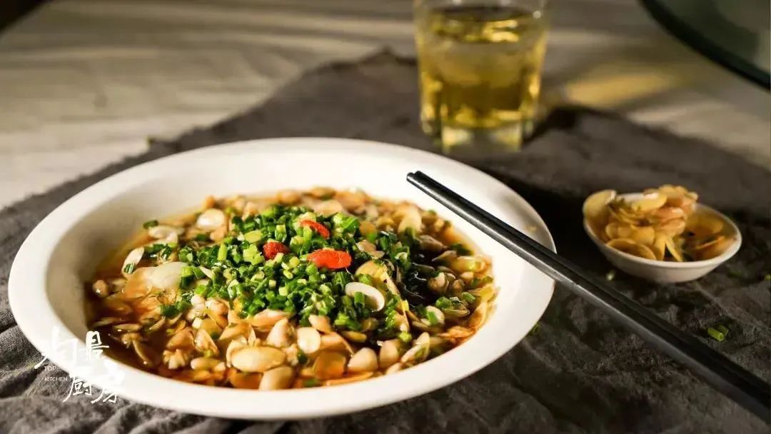 17:50将吐完沙的海瓜子烫熟,后淋上热油,加入酱油、糖、蒸鱼豉油调味。耗时10分钟。冰箱里的糟毛豆和白斩鸡别忘了拿出来哦!