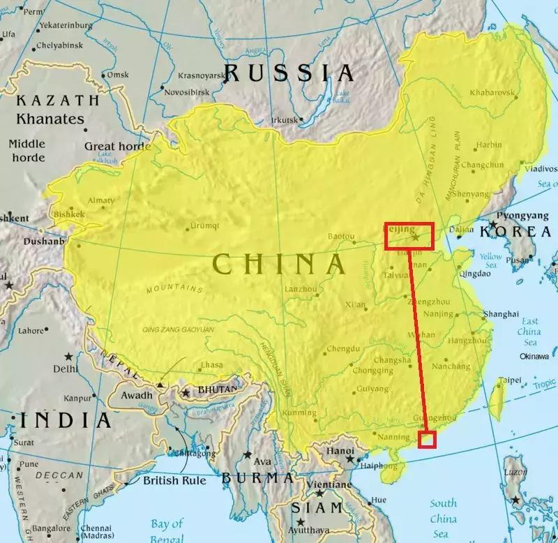 英军从本土与印度调兵的路线图然而在此后的战争中,英国人发现他们是多虑了。两个多世纪以来,清军几乎未遇到过火力强于自己的对手。无论是北方的哥萨克和蒙古,还是南方的缅甸与尼泊尔,都无法用武器优势去制衡自身数量太少的缺陷。清军也自然养成了用各种枪炮进行火力倾斜的标准战术。但这一切在1840年的英军看来,未免是太小儿科了。