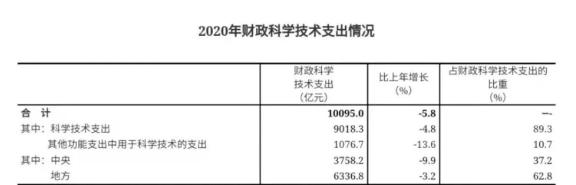2020年,国家财政科学技术支出10095.0亿元,比上年减少622.4亿元,下降5.8%。其中,中央财政科学技术支出3758.2亿元,下降9.9%,占财政科学技术支出的比重为37.2%;地方财政科学技术支出6336.8亿元,下降3.2%,占比为62.8%。