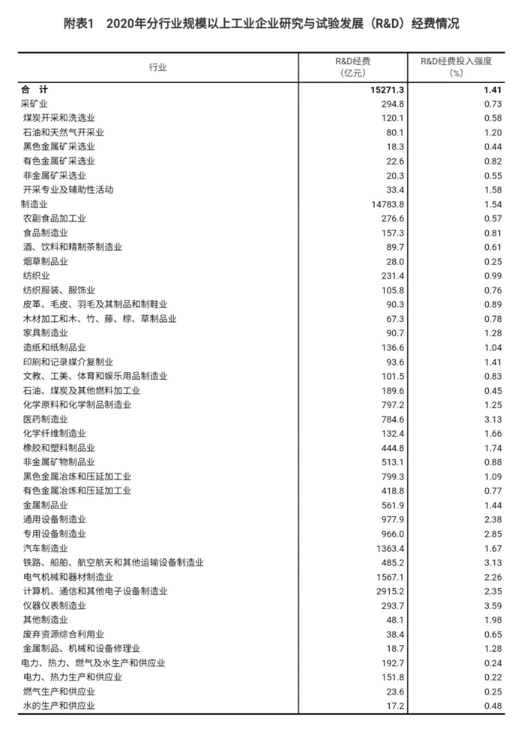 分产业部门看,高技术制造业研究与试验发展(R&D)经费4649.1亿元,投入强度(与营业收入之比)为2.67%,比上年提高0.26个百分点;装备制造业研究与试验发展(R&D)经费9130.3亿元,投入强度为2.22%,比上年提高0.15个百分点。在规模以上工业企业中,研究与试验发展(R&D)经费投入超过500亿元的行业大类有10个,这10个行业的经费占全部规模以上工业企业研究与试验发展(R&D)经费的比重为73.6%(详见附表1)。