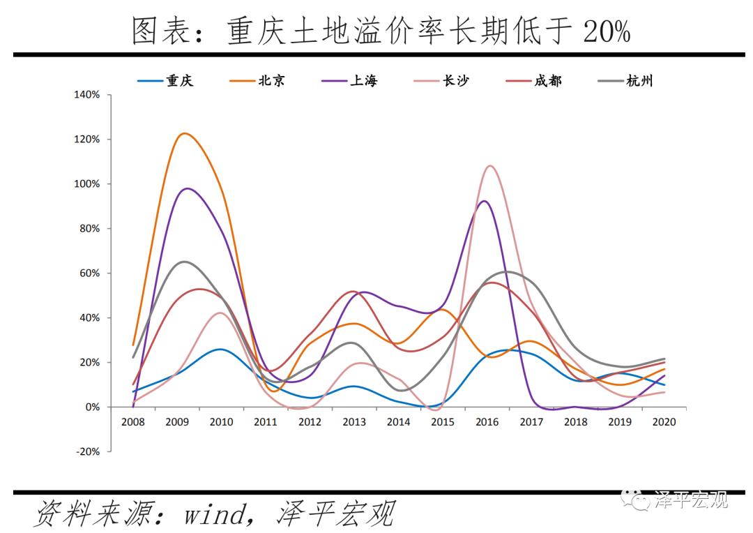 重庆地票、土储制度等使重庆保持了大量土地供应,维持了“楼面地价不超过当期房价的三分之一”,以控地价来稳房价。如果一地块周边当期房价1万元/平米,地价拍到3300元/平米就要适可而止,否则就会推高房价。当土地供应是比较充分、合理、有效的时候,如果地价偏高,就拿出政府的储备地增加土地供给平衡地价。重庆2008-2020年间成交楼面土地均价占房价均值的25%,其他一二线城市如北京、杭州、成都分别为48%、45%、35%。从土地溢价率看,重庆土地溢价率波动较小,且土地溢价率保持在20%以下,普遍低于其他重点城市。从人均住宅类供地建面看,重庆人均住宅土地供给充足,处于全国前列。重庆自2008年起,为每人每年新增供应住宅土地建面在1-2平米之间,约为北京、上海、广州的两至三倍。