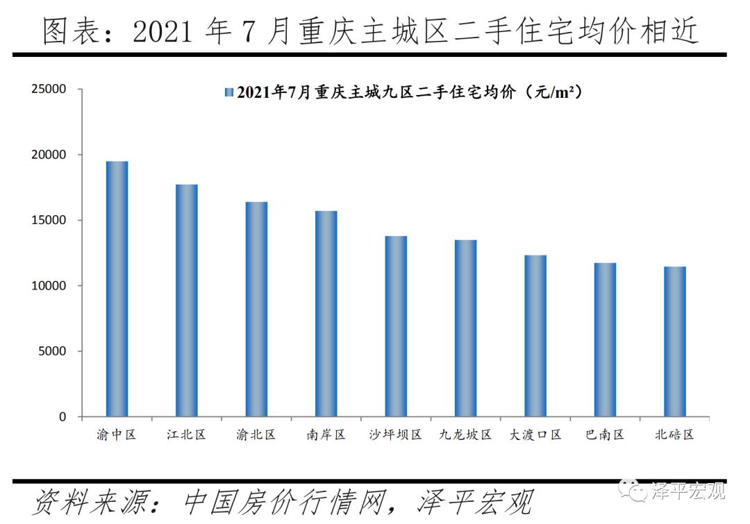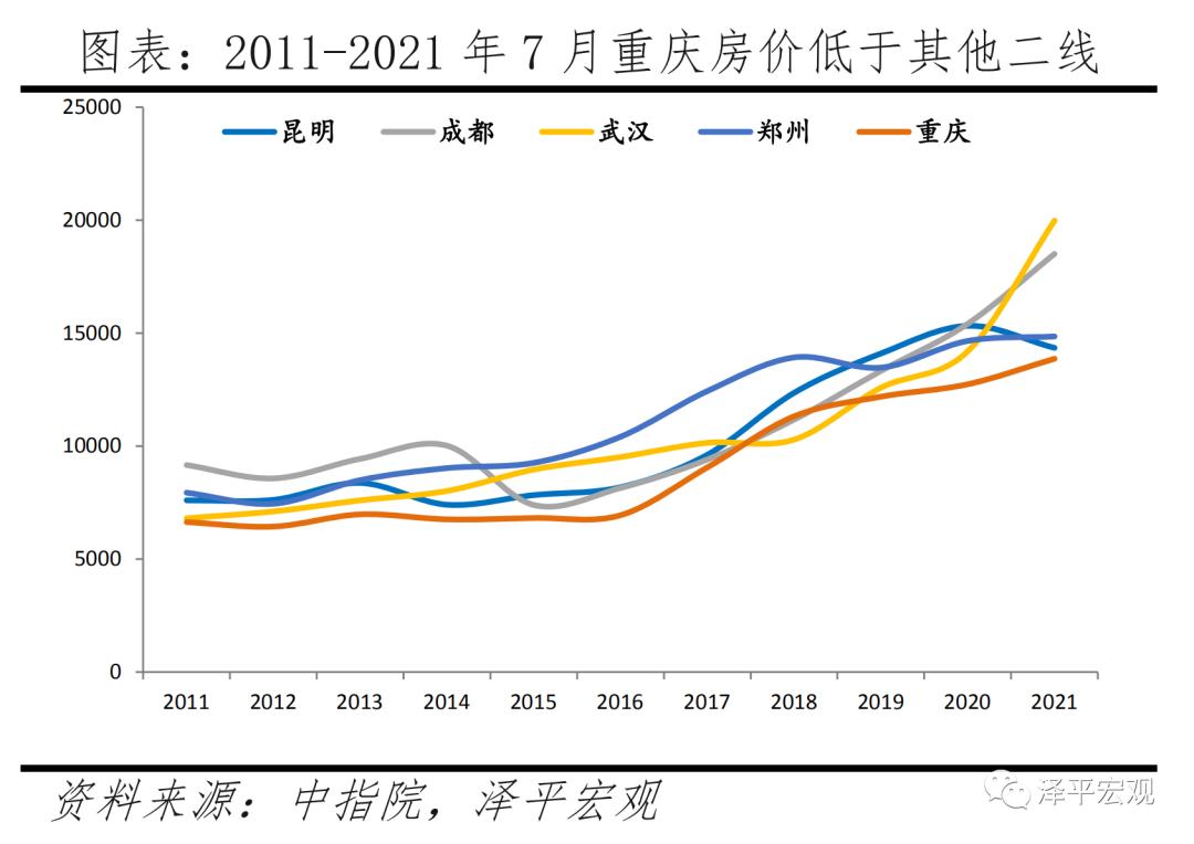 从房价绝对值看,2021年7月重庆二手住宅1.4万元/平,低于南京、成都、天津等二线城市;从房价收入比看,2010-2019年重庆在8.4-11.5,处于主要城市中下游;从涨幅看,重庆十年年均涨幅7.4%,低于主要一二线城市。从二手商品住宅价格看,根据中指院数据,2011-2021年7月重庆住宅二手房均价从6634涨至14108元/平米,成都、天津分别从9437、9345元/平涨至 17630、17349元/平。与一线城市比,上海普陀区均价7.8万/平的两室一厅,76平价值约560万,可在重庆沙坪坝区买同层次二手房5.6套。从房价收入比看,2010-2019年重庆稳定在8.4-11.5,在主要大城市居于中下游,同期上海在20.6-26.6,杭州在11.2-16.4。从涨幅看,根据中指院数据,2011-2021年7月重庆商品住宅年均涨幅7.4%,在18个一二线样本城市中排第14。在2014-2017年间重庆经历了GDP增速领跑以及2016年我国一二线城市房价快速升温,但重庆房价增速仍处较低范围。2014-2017年重庆商品住宅年均涨幅9.6%,甚至低于徐州、金华等三四线城市。重庆在经济快速增长的同时兼顾“稳房价”,其成果引人注目。