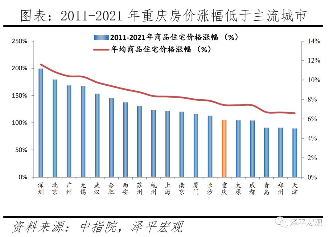 过去十年在全国大部分一二线城市房价大涨的背景下,重庆房价、房价收入比、涨幅在全国主要城市处较低水平。重庆在经济快速增长的同时兼顾“稳房价”,其成果引人注目。