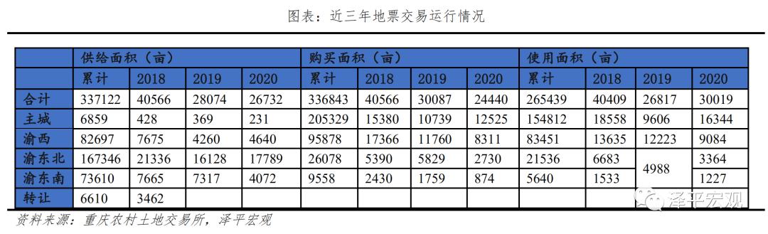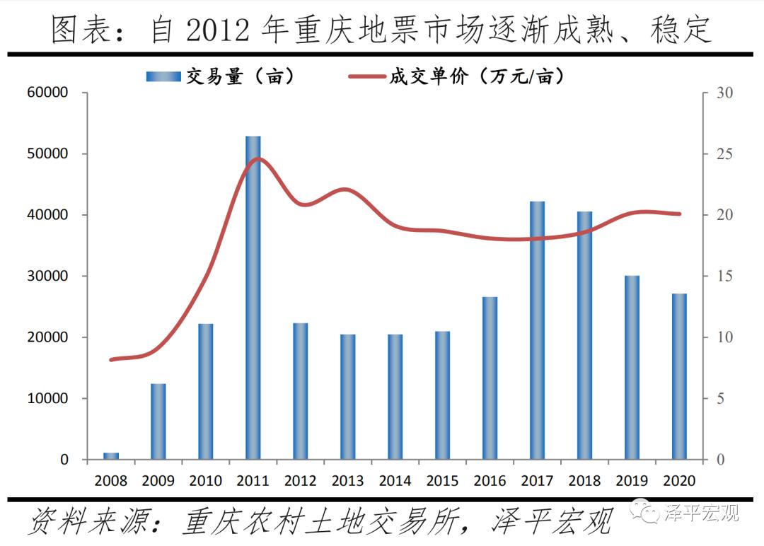 2)首创“地票制度”,地票是跟随农民进城的市场化“人地挂钩”。重庆地票交易面积大,累计贡献了超三成的土地供应,经历了十余年的发展,地票制度也趋于成熟,是历经考验的土地交易制度;