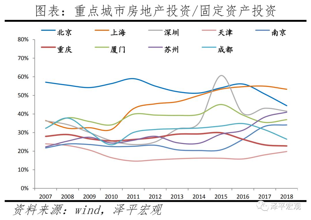 2.1.5 房地产固定资产投资:把握金融源头,控制投资力度早在2008年重庆提出“每年房地产固定资产投资不超过全市固定资产投资的25%,即不超过GDP的1/6”。房地产固定资产投资大于25%会导致供过于求,超过一般城市化进程所需的金融资源会导致泡沫,相反则会影响城市的正常发展。重庆政府、国土资源等部门会对每个楼盘的规划审批严格把控,以保证房地产固定资产投资占比,维持供求平衡。从具体方法看,房产商买地以后,每个楼盘都由政府做控制性详规、建设设计规划,并由国土资源和房屋管理、规划局批准。如果当月房产投资量超过25%,把部分房地产商报来的规划件暂时搁置;如果低于25%,有关部门按法规批准即可施行,加快建设进度。其次,在建设部门也有一些手续上的快慢可以由政府把控。从房地产投资占固定资产投资总额比重看,自2009年起,十余年间重庆的房地产投资占总投资额比重始终在 25%左右。2007-2018年间重庆的房地产投资占总投资额比重均值为26%,与一线城市相比,北京、上海、深圳房地产投资占比偏高,均值分别为54%、44%、36%;与二线城市相比,天津、厦门、成都分别为18%、38%、31%,与25%左右的标准相差较大。
