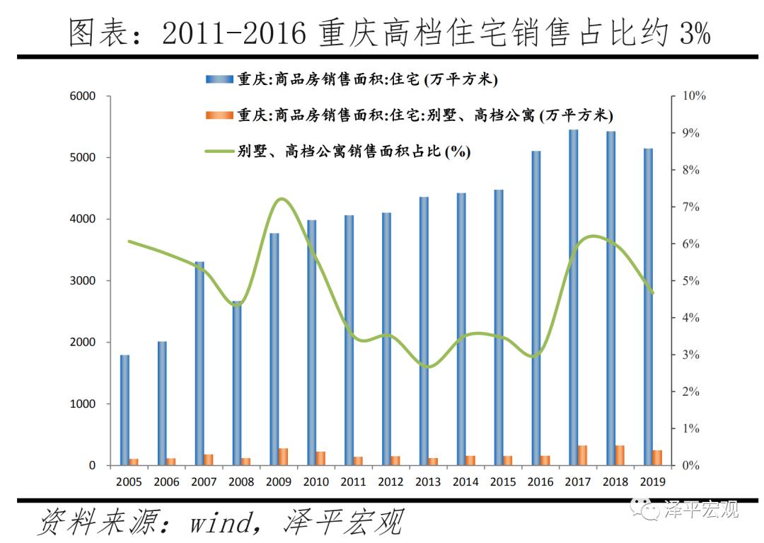 2.2.2 重庆房地产税试点,高端有约束1)2011-2016年间,重庆政府采取“高端有约束”的区别化房地产调控思路,开展第一批房产税试点,利用税收工具抑制高端住房需求,调节收入分配。2011年1月重庆出台了《重庆市关于开展对部分个人住房征收房产税改革试点的暂行办法》,宣布启动对部分个人住房征收房产税。在征税对象上,重庆房产税主要针对个人拥有的独栋商品住宅和个人新购的高档住房。税率方面,采用0.5%至1.2%的累进税率。以重庆户籍居民新购的一套20000元/平的160平高档住房为例,其免税面积为100平,房产税0.5%,每年需缴纳房产税约6000元。若为“三无人员”则不扣除免税面积,每年需缴纳房产税约16000元,房产税对别墅、高档住宅的购买需求、炒房行为均带来一定的压力。从税收总额看,2011年起重庆房产税征税20.9亿,相较2006-2008年间10亿元的征税量大幅上升。2011至2017年间重庆房产税收入超过20亿元且呈逐年增长趋势。从短期看,房产税的实施在一定程度上为高端住房需求快速降温,2009年起别墅、高档住宅成交占所有商品房成交面积的7.2%左右,而在2013年已降至2.7%。从长期看,2013-2016年间高档公寓的交易逐渐稳定,销售占比维持在3%;2016年房地产市场爆火的影响,高档住宅受到追捧,也仅仅上升到6%的销售面积占比,2018年开始下滑回稳,反映了长期高端住宅需求受房产税的抑制后,购房需求向中端市场转化的趋势。