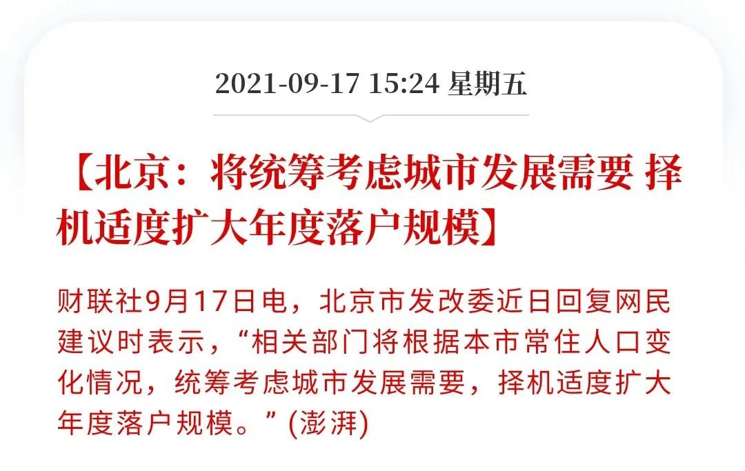 随后,北京市发改委表示:“相关部门将根据本市常住人口变化情况,统筹考虑城市发展需要,将择机适度扩大年度落户规模。”